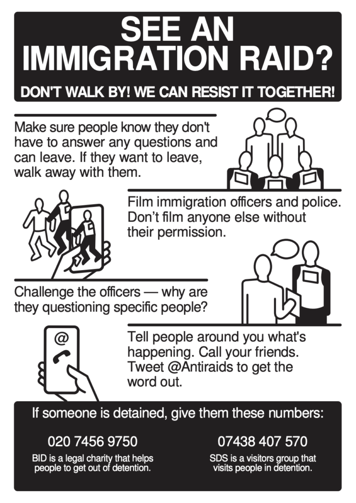 The Anti Raids Network (ARN) is a loose, volunteer-led network of groups and individuals who share information and resources to help communities resist immigration raids. It is not one organisation and has no leaders. Instead, people work together to spread practical knowledge about people’s rights, support neighbours during enforcement visits, and challenge immigration controls on the street. ARN focuses on mutual aid, direct action, and solidarity, helping communities stay safe, informed and connected.