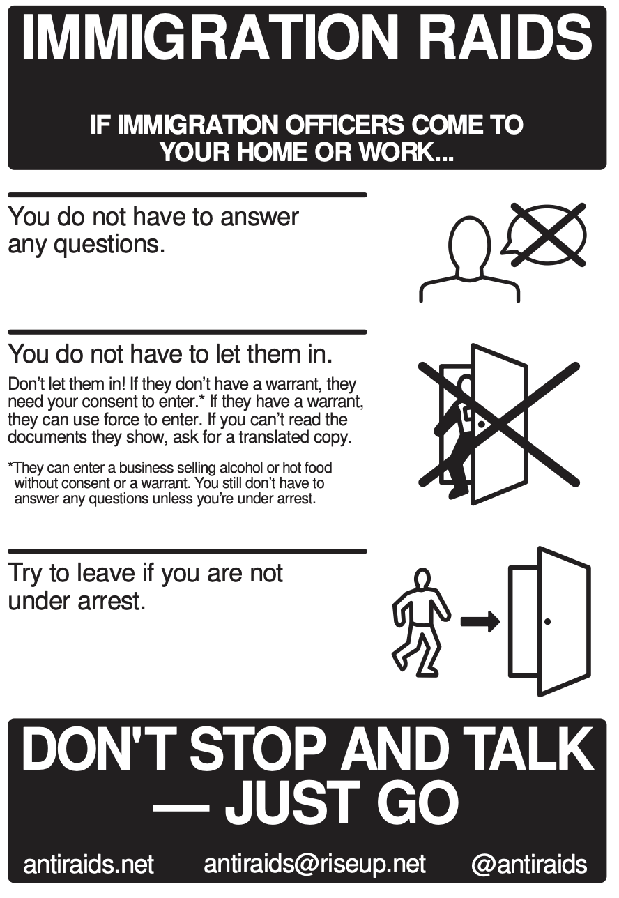 When Immigration Officers come to your home or workplace, it can be a shocking and frightening experience. Raids can happen early in the morning, in front of neighbours, children or colleagues. It is normal to feel scared, confused or angry. You still have rights, and you still have choices.