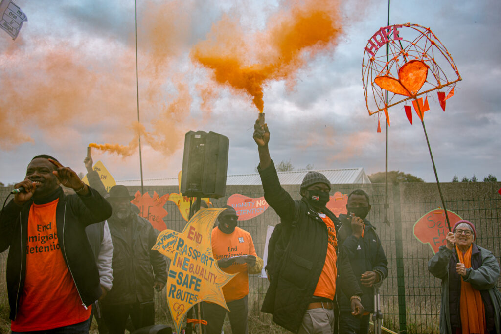 Outside the high fences and grey concrete of the detention centre, colour, movement and music broke through. We brought our own flags which say ‘No One Is Illegal’ and ‘Solidarity Knows No Borders’ – the flags that we are proud of and live by. They flew high in the sky. We wore the signature orange colour – warm, alive and uncontainable – showing our defiance against the bleakness of the October grey skies. As more people arrived we danced with our bright placards emblazoned with messages of strength and solidarity. We danced not to minimize the suffering and pain on the other side of the wall, but as a way to remember that our bodies belong to us, that we refuse to be small and silent. In the remote isolation of Derwentside, where stories, suffering and violence are deliberately hidden from view, our noise and colour became resistance. The government may try to bury these places in silence, but we gathered in community, loud, bright, and unafraid, making sure that even here, joy could not be contained.