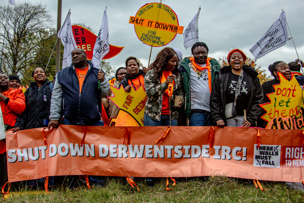 On Saturday 18 October, nearly 200 of us gathered outside Derwentside IRC in County Durham, to mark the National Day of Solidarity to End Immigration Detention 2025. One of the most visible symbols of the cruelty and violence of the Hostile Environment, Derwentside Immigration Removal Centre – formally known as Hassockfield – is the only center in the UK to house women for an indefinite period of time. Situated in a remote area within a Reform UK stronghold, the location was a powerful setting for our demo, intended to shine a light on the centre as well as all other immigration detention centres across the UK and raise public awareness of the injustices it represents.